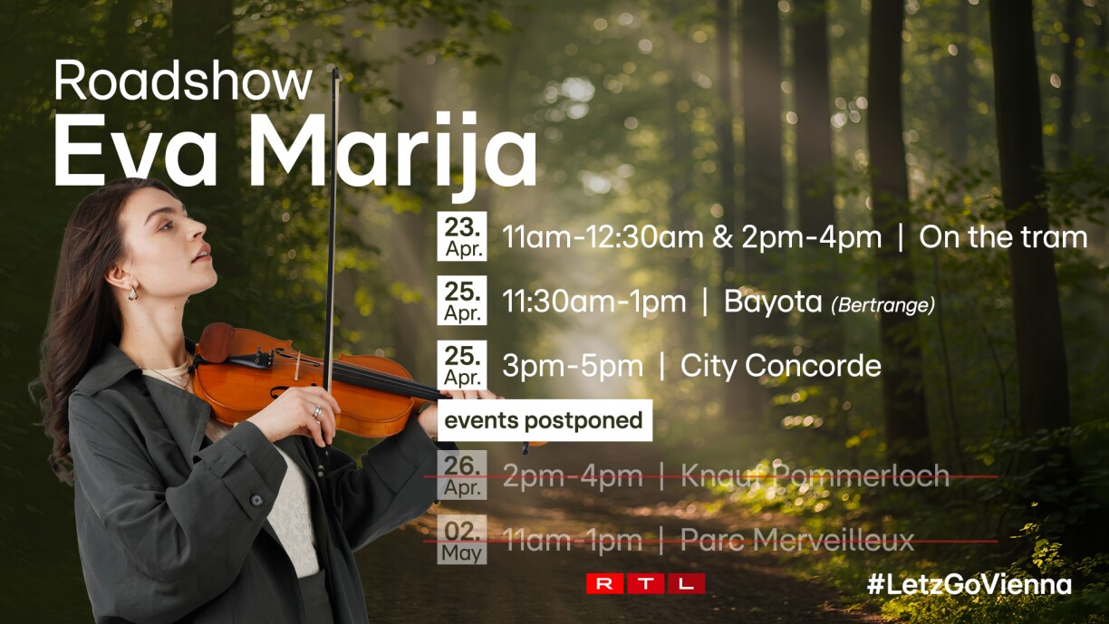 The tour kicks off on 23 April, with a first show in Luxembourg City, where Eva will perform twice aboard the tram between Luxexpo and Bonnevoie – once in the morning and again in the afternoon. Just two days later, on 25 April, she will continue to Bertrange for a stop at Bayota, followed by another appearance later that same day at City Concorde. On 26 April, the roadshow was scheduled to move on to Knauf Pommerloch, before concluding on 2 May at Parc Merveilleux. The latter two dates have since been postponed.
